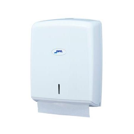 Dispensador de toallas de papel secamanos Jofel Smart. Fabricado en ABS blanco de alta calidad y resistencia . Cerradura con llave, visor de carga de toallas y frontal abatible. Admite hasta 600 toallas tipo zig-zag. Recarga de toallas fácil, rápida y sencilla. Higiénico: Evita a contaminación por contacto manual con las toallas. Robusto y de larga duración. Fácil mantenimiento y limpieza.