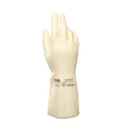 Guantes reutilizables de látex natural con acabado clorado color blanco/rubio 1 par. Sin siliconas. Idel para la industria mecánica para le montaje de pequeñas piezas con o sin grasa, la industrial alimentaria y la limpieza en general.