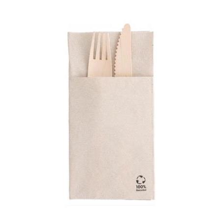 Servilleta de celulosa reciclable plegada i-one para guardar cubiertos García de Pou. Esta servilleta con diseño canguro está fabricada en tissue reciclado color natural de18g/m2, muy resistente y con una capacidad de absorción superior. Sus dimensiones desplegada es 40x40cm.1600uds